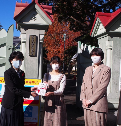 令和2年11月24日(火)、奈良女子大にて、奈良女子大学恋都祭実行委員の本荘智美さん、西木まなみさんより、11月1日から3日までオンラインで開催された学園祭「第69回恋都祭」において実施したチャリティーくじの収益金等による募金の総額35,817円を、昨年に引き続き赤い羽根共同募金としてご寄付いただきました。